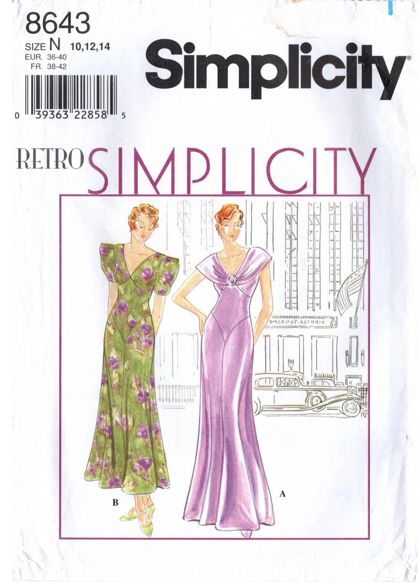 Simplicity 8643 which includes the full-size tissue-paper pattern pieces and instructions for making these bias-cut dresses with flared gored skirt stitched to shaped midriff with back zipper and V-neckline. View A is long length with gathered portrait collar and self fabric rose and is sleeveless. View B has short pleated sleeves. Use the zoom feature for a closer look. Let me know if you’d like to see the envelope back. This is sized for Misses’ 10-12-14 (32-1/2 to 36″ bust). The UPC is 0-39363-22858-5.