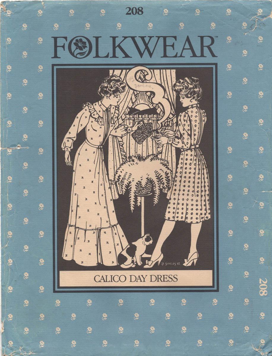 Folkwear 208 includes the full-size pattern pieces, and instructions for making the Calico Day Dress. Enlarge the photo for a better look at the details. Let me know if you’d like to see the envelope back. This is sized for Misses’ 6-16 (30-1/2″ to 38″ bust). The envelope measures 11-1/2″ x 8-3/4″ and the pattern is printed on bond paper.