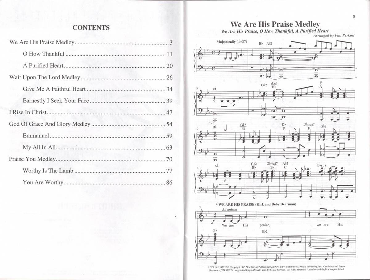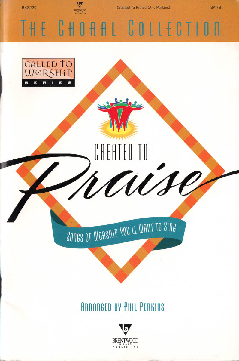 Created To Praise: The Choral Collection from the Called To Worship Series by Brentwood Music with 1996 copyright. The ISBN is 0-7601-0664-9. Arranged for SAT(B) by Phil Perkins. See the Contents page and the first page of the first song to get a sense of what this is like. Includes vocal line with piano accompaniment and guitar chords. This paperback music book measures about 10-1/4″ x 6-3/4″ and has 94 numbered pages with staple binding.