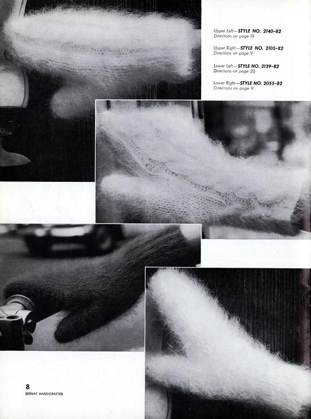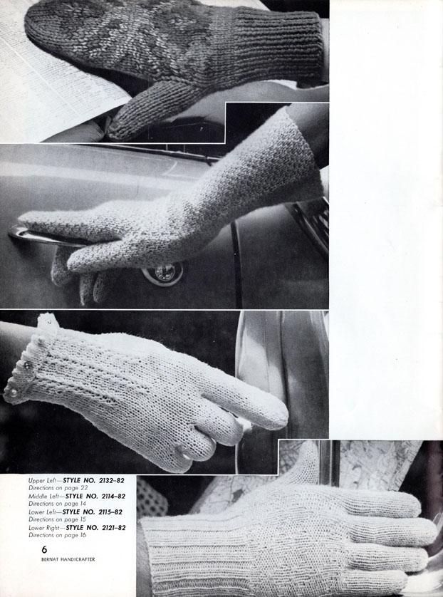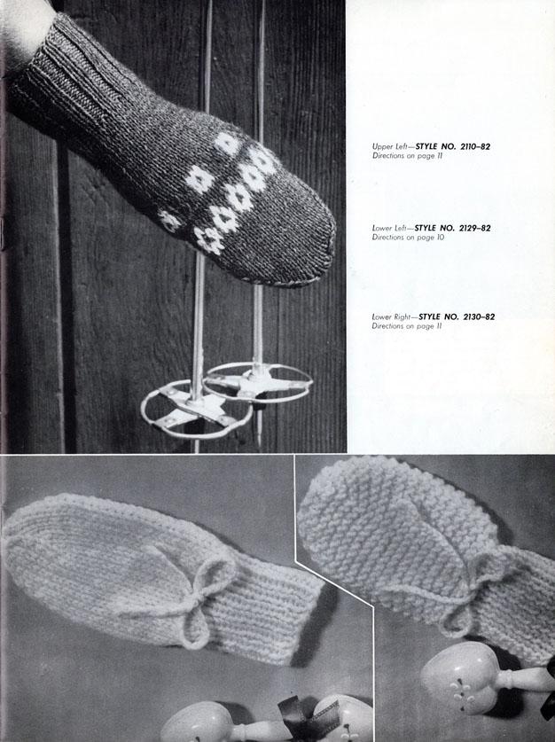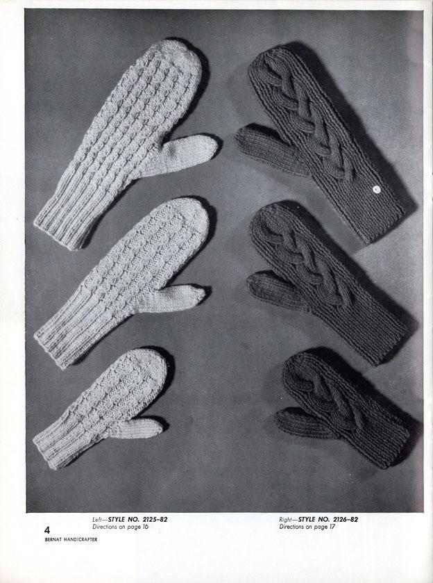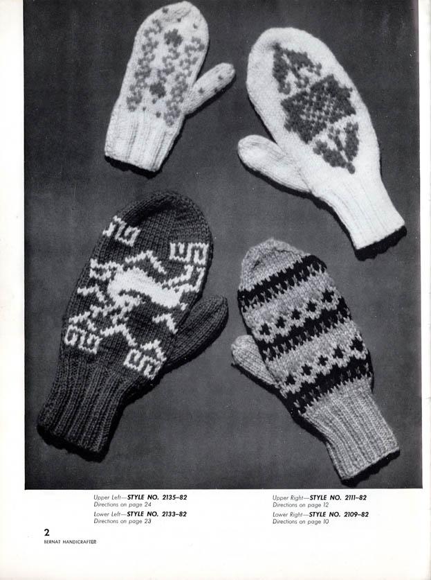 PDF of Gloves and Mittens For The Family – Book 82 from Bernat with 1959 copyright, this was from the 8th printing of unknown date. Includes 22 designs, most with three size options. The book includes hints for Canadians with American and British needle sizes and some English/French word translation. All designs are shown in b/w photos with some shown in color on the front cover. This book measured about 11-5/8″ x 8-3/4″ and has 28 pages including the covers.