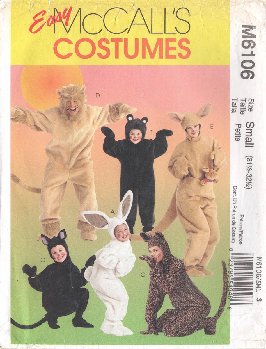 McCall’s 6106 which includes the tissue paper pattern pieces and the sewing instructions for making the jumpsuit with separate hood animal costumes shown. Your choice of fabric, ears, and tails make these a lion, bear, kangaroo, cat, bunny, or leopard. Zoom in to see the details on these. Let me know if you’d like to see the envelope back. Sized for teens/adults who wear size Small (31.5 to 32.5″ chest). The original price of this 2010 pattern was $13.95 and the UPC is 0-23795-54948-6.