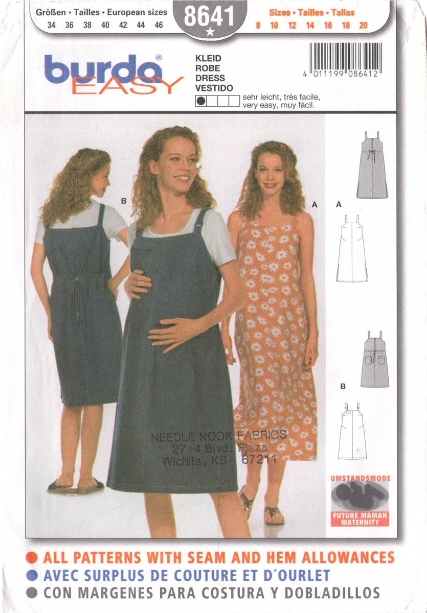 Burda 8641 which includes the full-size tissue paper pattern pieces and the instructions for making this maternity jumper or sewaa with optional under-bust casing, side slits and patch pockets. Use the zoom feature for a closer look. Let me know if you’d like to see the envelope back. This is sized for women who wear Misses’ sizes 8-10-12-14-16-18-20. The UPC is 4-011199-086412.