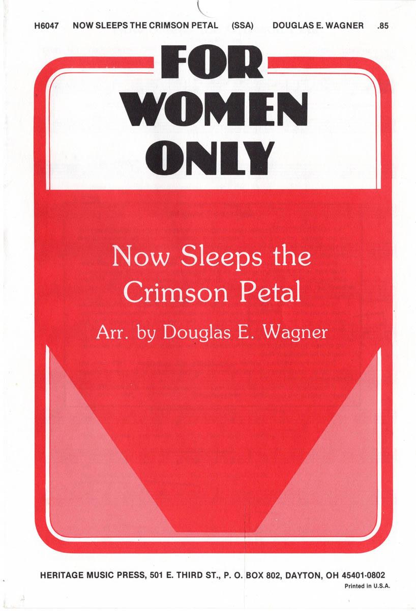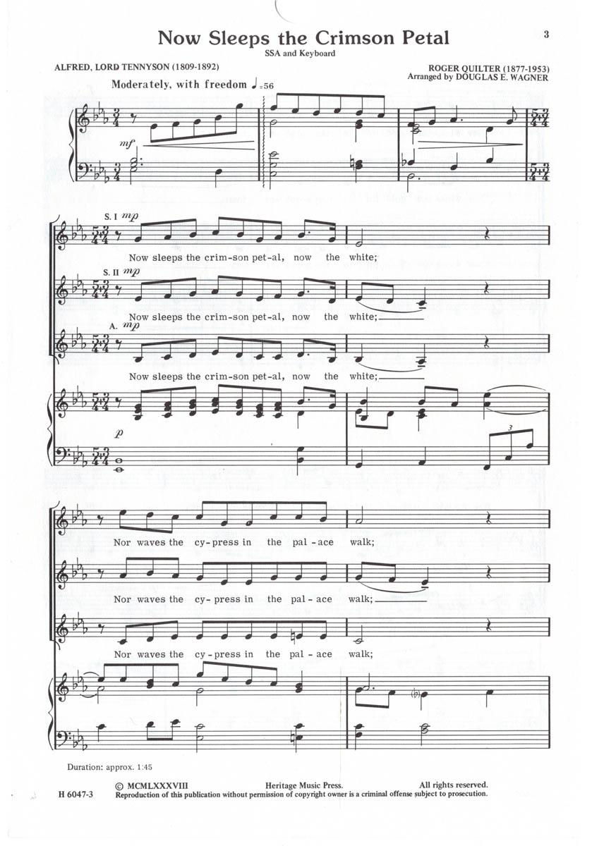 Now Sleeps the Crimson Petal with words by Alfred, Lord Tennyson and music by Roger Quilter, arranged for SSA choirs with piano accompaniment. This song suggests his love do as the flowers and “slip into my bosom and be lost, be lost in me.” See the first page of the song to get a sense of it. It has 1988 copyright by Heritage Music Press. This measures about 10-1/4″ x 7″ and has eight pages with the music on four of them.