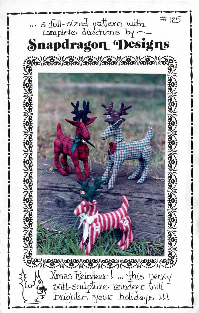 Xmas Reindeer – pattern #125, designed by Chris Calloway for Snapdragon Designs of Sacramento, California, with 1989 copyright. The previous owner purchased fabric, ribbon, eyes and jingle bell as shown. Let me know if you don’t want these. I can reduce the postage by 75 cents if these things are removed. Enlarge the photo above for a better look. Let me know if you want to see anything else.